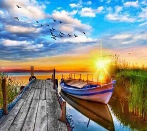 Malowanie po numerach Jezioro Stary pomost z łódką na tle zachodu słońca 50x40cm 1005607