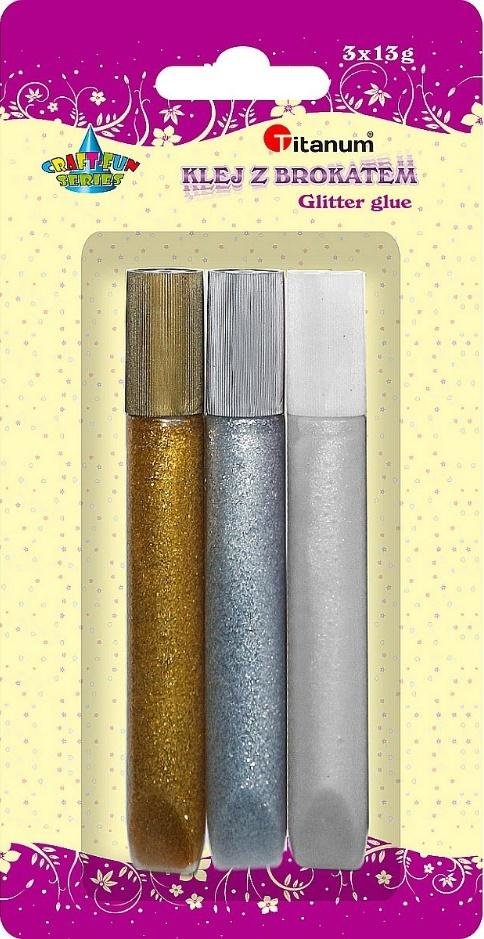 Klej z brokatem. Zakręcane tubki, pojemność 3 x 13 g, komplet 3 kolorów: srebrny, złoty, perłowy. prečítať celé