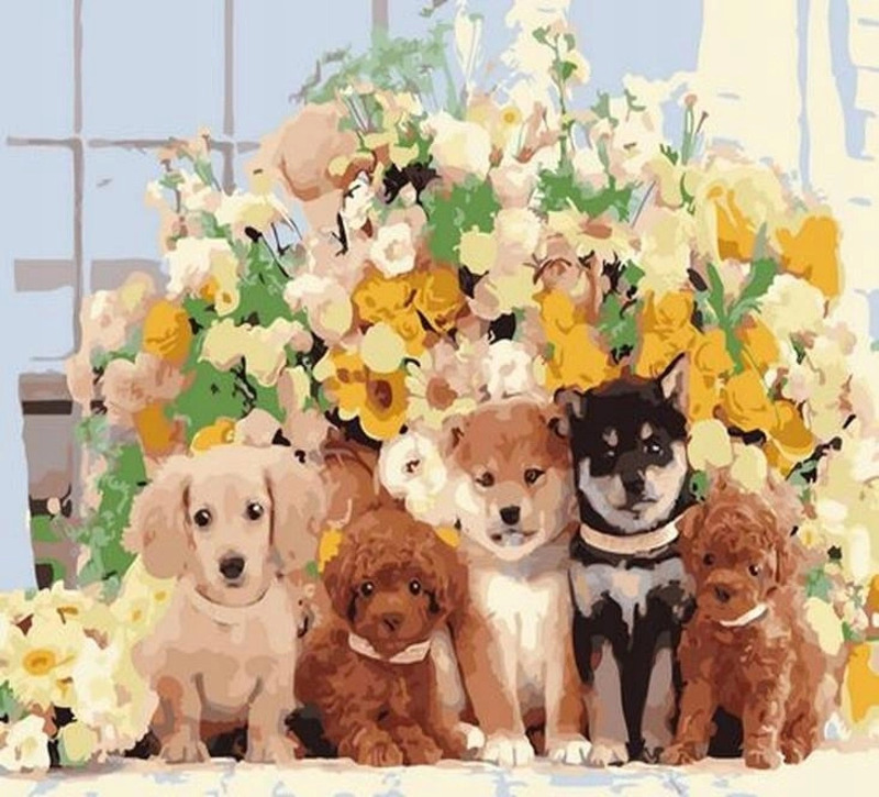 Malowanie po numerach Pięć piesków na tle kwiatów 50x40cm 1008929