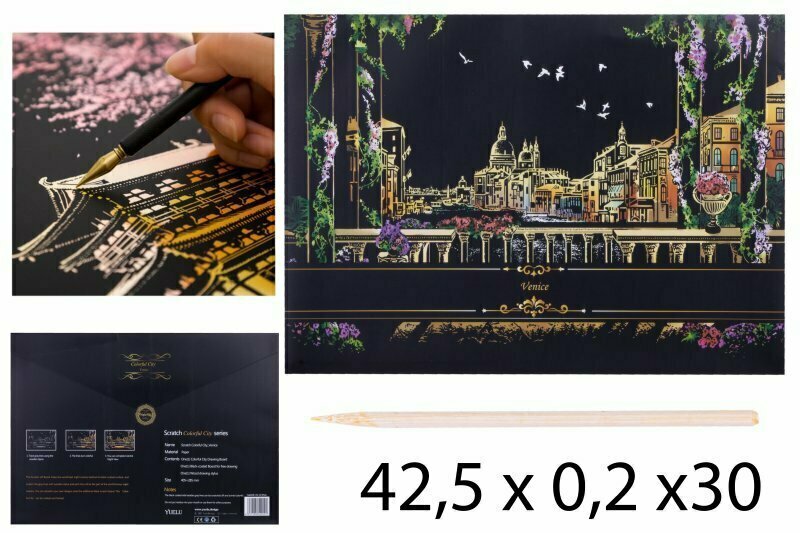 Manualna zabawa, skierowana do kreatywnych osób. Efektem są śliczne stylowe, srebrne obrazki na czarnym tle zadziwiające detalami i płynnie zmieniającymi się kolorami. Dzieci z łatwością posłużą się dołączonym rysikiem i po naniesionych na czarnym filmie konturem zdrapywać będą kreski tworząc zmyślne kształty.Wymiary opakowania: 42x30 cmWiek: 6+