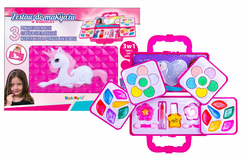 Idealny produkt na prezent dla małej artystki makijażu.Dzięki rozkładanej walizeczce możesz zabrać swoje ulubione produkty zawsze ze sobą.Walizeczkę ozdabia piękny biały jednorożec.Zestaw zawiera:12 kolorowych cieni do powiek14 barwnych i pachnących błyszczyków do ustżele z brokatempomadkę do ustlakier do paznokcilusterkoakcesoriaWymiary opakowania : 17 x 13 x 5,5 cmWiek : 3+