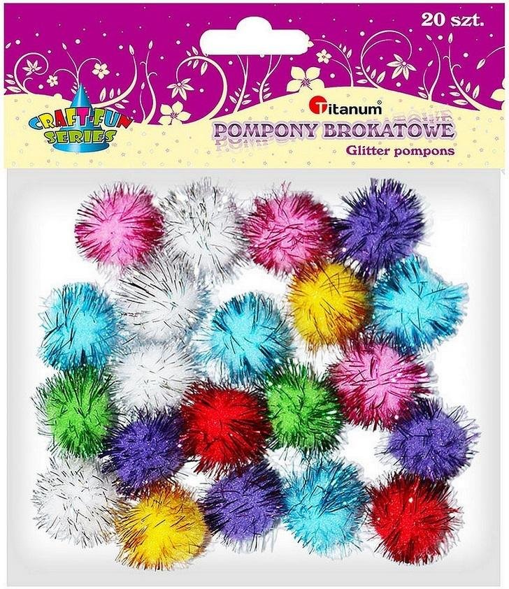 Pompony brokatowe. Kolor: zielone, białe, czerwone, fioletowe, niebieskie, żółte, różowe. Średnica: 25 mm. 20 szt. w opakowaniu prečítať celé