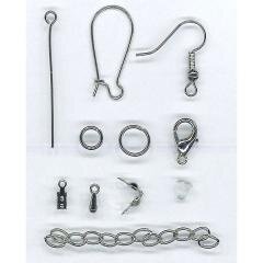 Akcesoria do biżuterii 191 elementów srebrneszpilki jubilerskie z łepkiem (gwoździe) 35mm - 15szt., haczyki jubilerskie 35mm - 15szt., bigle zapinane 11x24mm - 8szt., bigle otwarte 18x19mm z kulką i sprężynką - 8szt., czapeczki ozdobne do koralików O7mm - 30szt., zapięcie karabińczyk 13x7mm -...