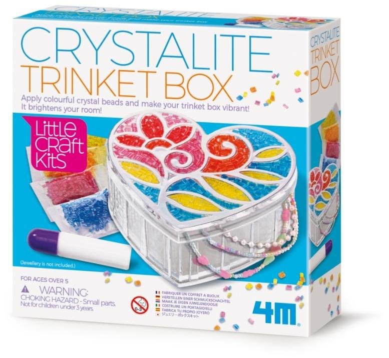 Udekoruj swój pokój tym wspaniałym małym pudełkiem na bibeloty! Użyj kolorowych kryształowych koralików, by stworzyć niepowtarzalne pudełeczko! Zestaw zawiera 1 przezroczyste pudełko (9 cm szerokości), 4 torebki z kryształowymi koralikami, 1 tubkę z klejem i szczegółową instrukcję. Wiek 5+.