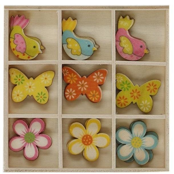 Drewniane dekoracje w drewnianym pudełku 105x105mm kolorowe9 wzorów x 3szt. kwiatki 27mm, motyle 30x22mm, ptaszki 30x28mm 27szt. prečítať celé