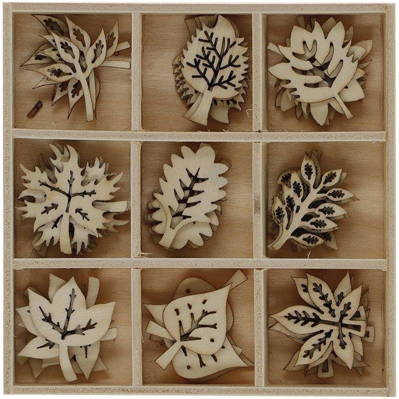 Drewniane dekoracje w drewnianym pudełku 105x105mm naturalne9 wzorów x 5szt. liście sklejka 1mm 45szt. prečítať celé
