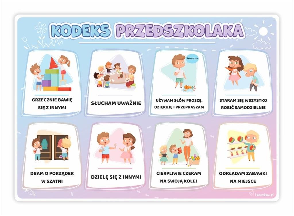 Kolorowy plakat kodeks przedszkolaka to idealny sposób aby przypominać dzieciom poprawne i uprzejme zachowanie.Kodeks można powiesić na ścianie lub tablicy - ociepli oraz urozmaici to wygląd szkolnej sali.Świetny sposób do tego aby przygotować przedszkolaków do czasu spędzonego w...