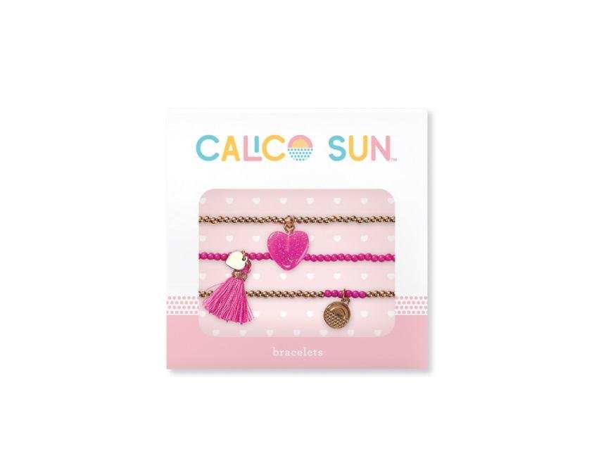 Pokaż trochę miłości!Pokochasz ten zestaw bransoletek! Różowej zawieszce z żywicy w kształcie serduszka, towarzyszą dwie inne: złote, mniejsze serduszko z różowym frędzelkiem i złota przywieszka Calico Sun.Ten zestaw bransoletek z koralików inspirowany jest różem i miłością. Różowe i złote...