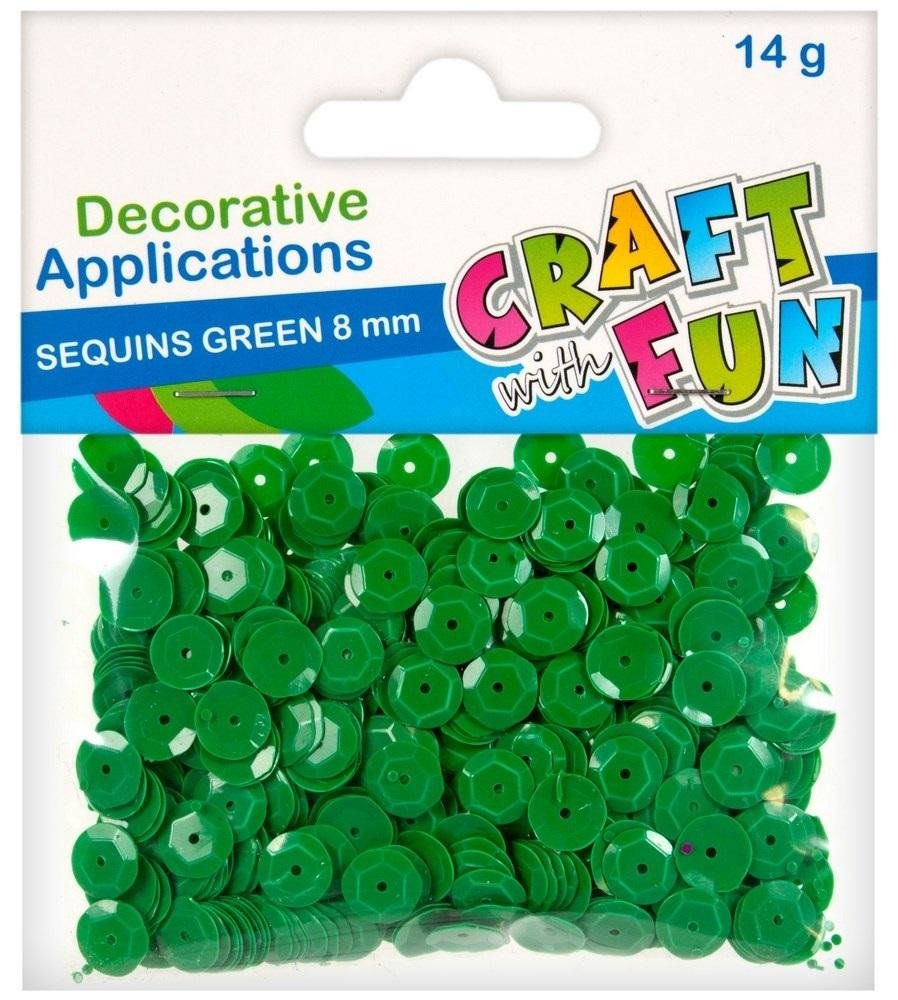 Cekiny metaliczne w zielonym kolorze. W opakowaniu 14 g.Przy pomocy Cekinów Craft With Fun można zaprojektować własne ozdoby lub dekoracje. Idealne do wykonywania wszelkich prac dekoratorskich, jak również do zabaw plastycznych, do wzbogacenia ozdób. Używaj tych produktów w połączeniu z innymi...
