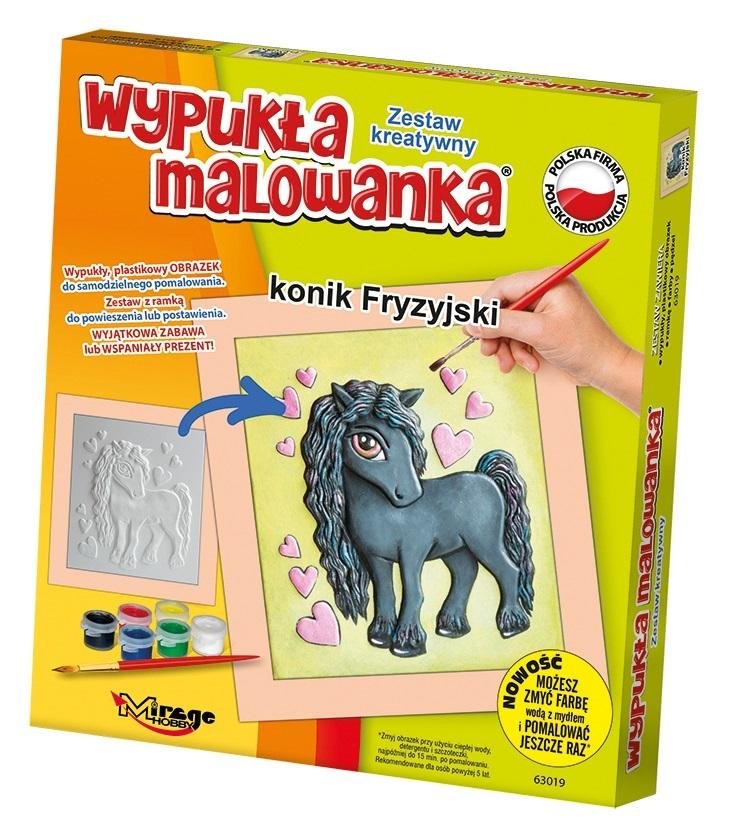Wypukła Malowanka od Mirage Hobby to Zestaw Kreatywny do malowania dla osób powyżej piątego roku życia. Zestaw zawiera wypukły, plastikowy, kształtny obrazek 3D, 6 farbek wodnych, pędzelek, ramkę z kartonu do postawienia lub powieszenia oraz schemat mieszania kolorów. Zmyj obrazek przy użyciu...