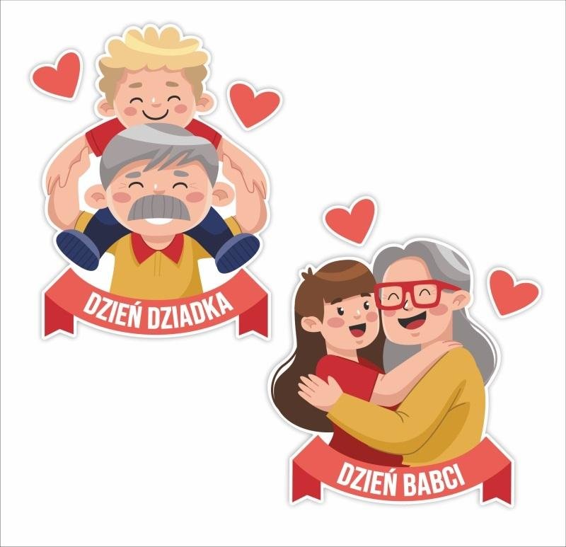 Zestaw zawiera 6 elementów - wydrukowanych dwustronnie!Dekoracje są wycięte, gotowe do powieszenia.Zestaw składa się z 2 dużych elementów z babcią i dziadkiem oraz 4 serc - idealne szczególnie do szkoły i przedszkola.Świetnie sprawdzi się jako ozdoba na okno w szkolnych lub przedszkolnych salach,...