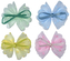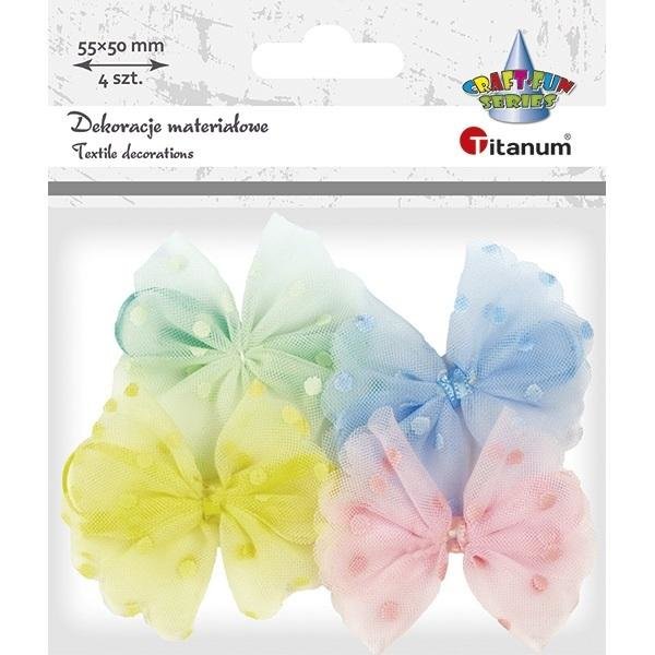 Aplikacje materiałowe kokardki 55x50mm tiulowe w groszki z satynową wstążką 3mm błękitne, jasnozielone, jasnoróżowe, żółte 4szt. prečítať celé