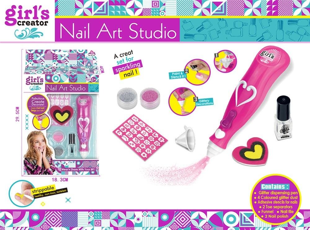 Bezpieczny zestaw z brokatami dla małej manikiurzystki stawiającej pierwsze kroki w świecie ozdabiania paznokci! Bezpieczny lakier bezbarwny mała stylistka może ozdobić przy pomocy brokatu i wzorzystych szablonów uzyskując nietuzinkowy wygląd! Dołączony do zestawu pilnik oraz dozownik brokatów...
