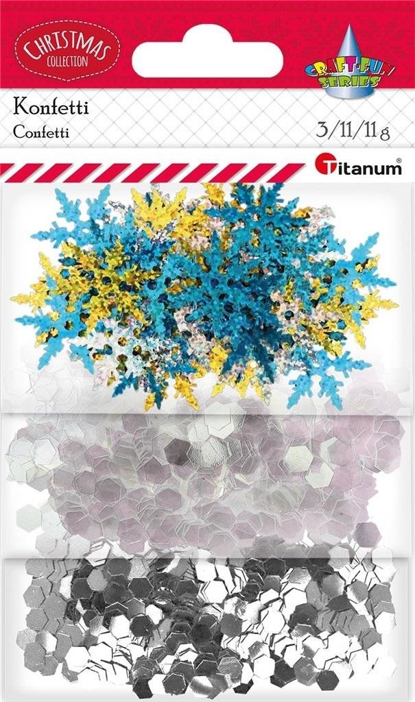 Konfetti mix 3 wzorów gwiazdki 35 mm złote, srebrne 3 g + okrągłe 7 mm miedziane, srebrne 11 g + sześciokąty 6 mm złote 11 g. prečítať celé