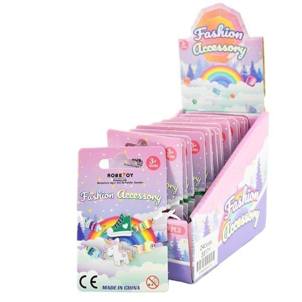 W display'u znajdują się 3 rodzaje zestawów bransoletek (po 2 szt). Każdego z zestawów jest 8 szt. Bransoletki są wysokiej jakości, wykonane z dbałością o szczegóły.Każdy zestaw składa się z 2 szt bransoletek, dobranych parami wzorów: ananas, tęcza mufinka, korona jednorożec,...