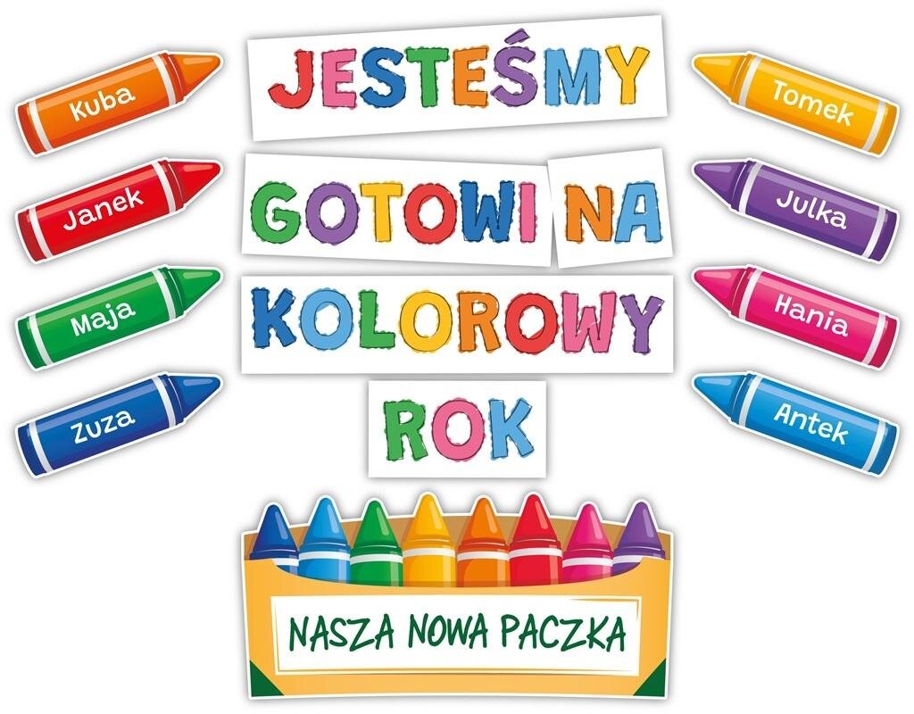 DEKORACJE KLASOWE - KOLOROWY ROK(13 elementów, jednostronna)Zestaw zawiera 13 kolorowych elementów.Dekoracje są wycięte, gotowe do powieszenia.Zestaw składa się z 1 pudelka z kredkami, 8 kredek z imionami oraz 4 elementów napisu JESTESMY GOTOWI NA KOLOROWY ROK.Idealny na rozpoczęcie roku w szkole...