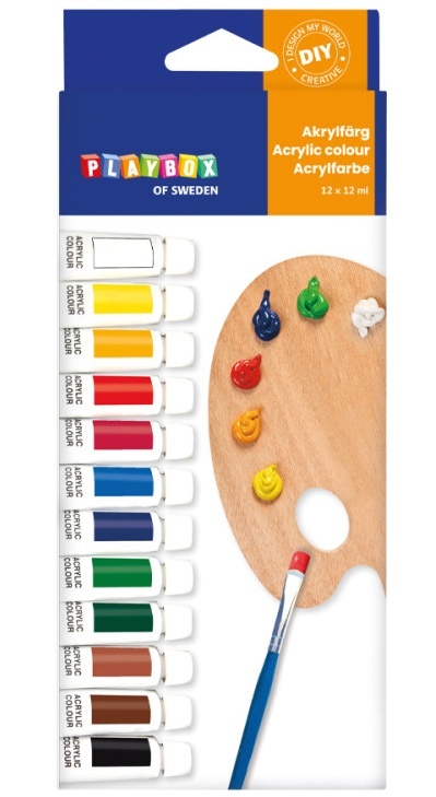 Balení obsahuje 12 barev (bílá, žlutá citronová, okrová, oranžová, červená, sv. modrá, sv. zelená, tm. modrá, hnědá, tm. modrá, černá) Vhodné na dřevo, keramiku, sklo, papír, plasty atd. Vodou ředitelné a omyvatelné. Barvy je možné vzájemně míchat k rozšíření barevné palety.