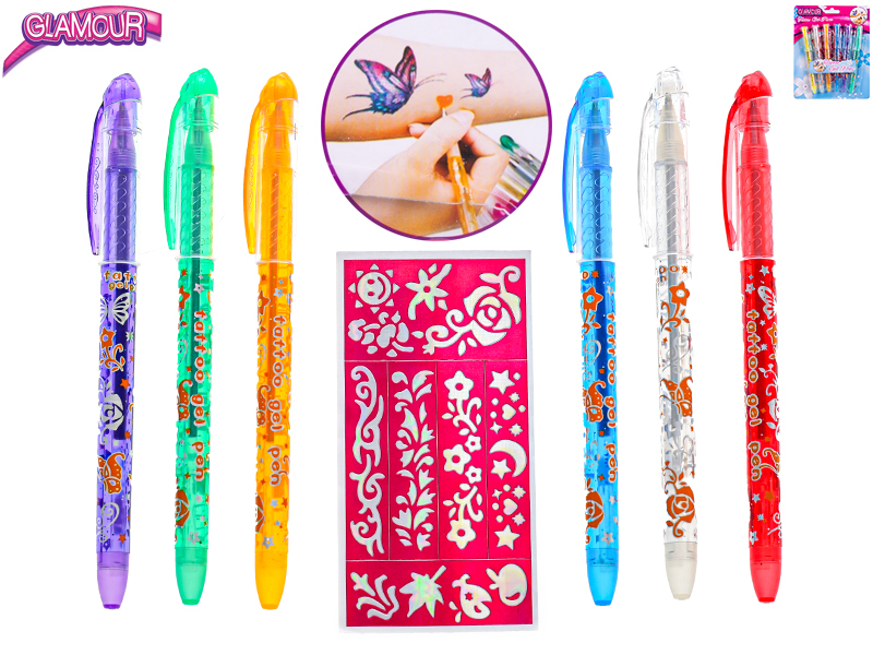 Glamour gelová pera tetovací s šablonami 6ks na kartě