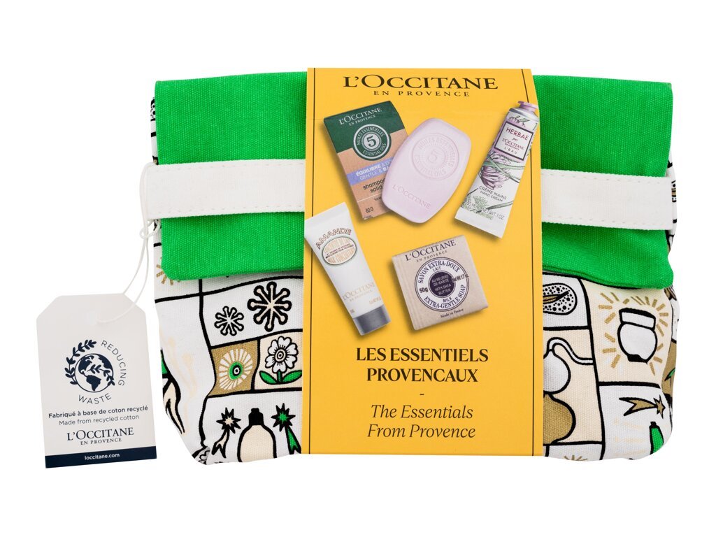 L'Occitane The Essentials From Provence tuhý šampon Gentle & Balance Solid Shampoo 60 g + tělový krém Almond Milk Concentrate 20 ml + tuhé mýdlo Milk Extra-Gentle Soap 50 g + krém na ruce Herbae L´Eau Hand Cream 30 ml + kosmetická taštička