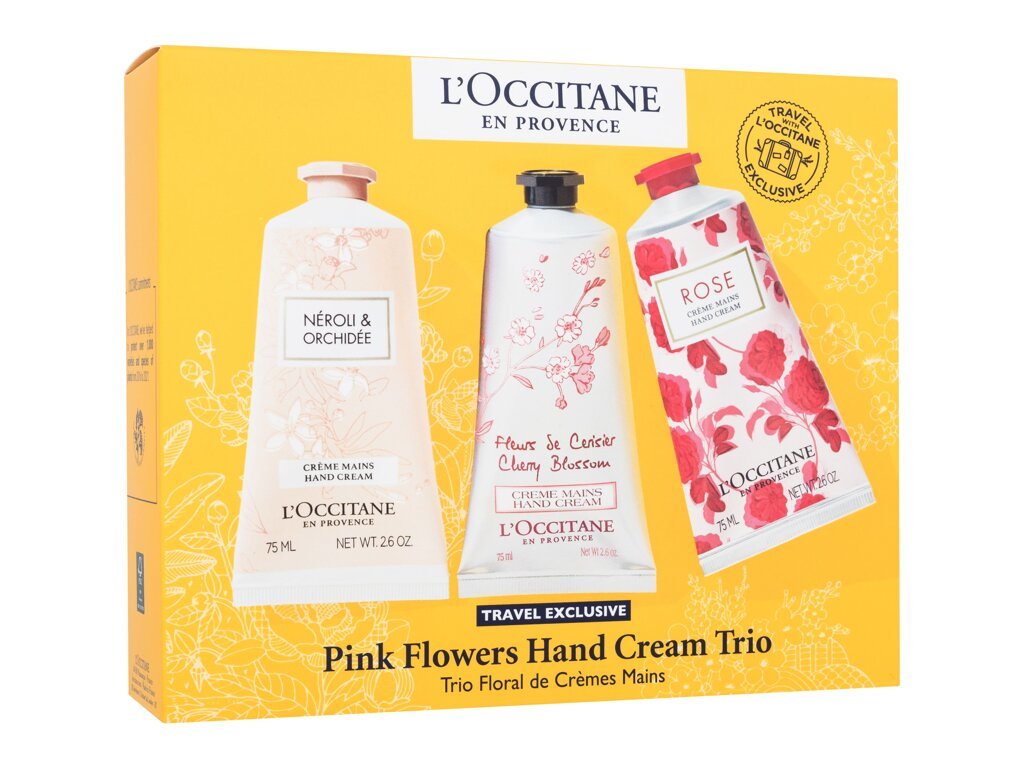 L'Occitane Pink Flowers krém na ruce Néroli & Orchidée 75 ml + krém na ruce Cherry Blossom 75 ml + krém na ruce Rose 75 ml
