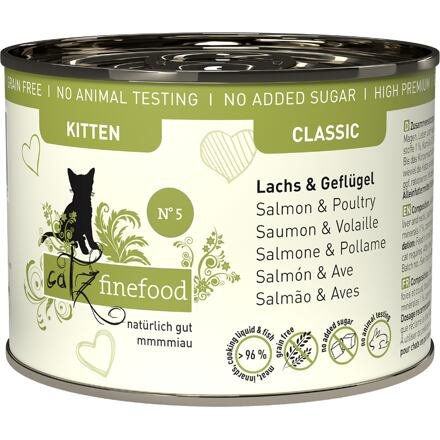 Konzerva CF Classic Kitten No.5 s lososom, hydinovým mäsom a špenátom je ideálnou voľbou pre chutnú, zdravú a vyváženú stravu vašich malých miláčikov. Pripravte svojmu mačiatku jedlo, ktoré nielen poteší jeho chuťové poháriky, ale aj podporí jeho zdravý rast a imunitu.