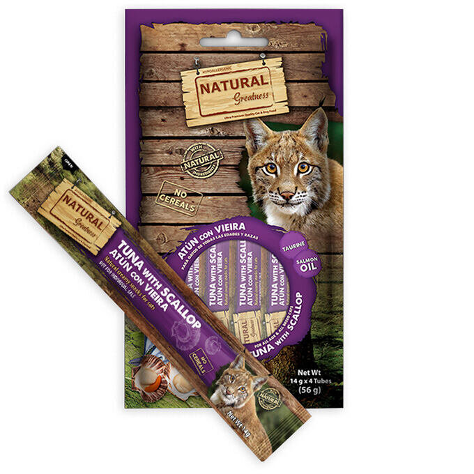 doplňkové krmivo pro kočky - pamlsek vhodné od 2 měsíců věku hypoalergenní krémová měkká pochoutka bez obilovin z prvotřídního masa tuňáka a mušlí hřebenatek obohacena o taurin, omega 3 a omega 6 z lososového oleje a DHA, které stimulují mozkové funkce ve všech fázích života kočky balení...