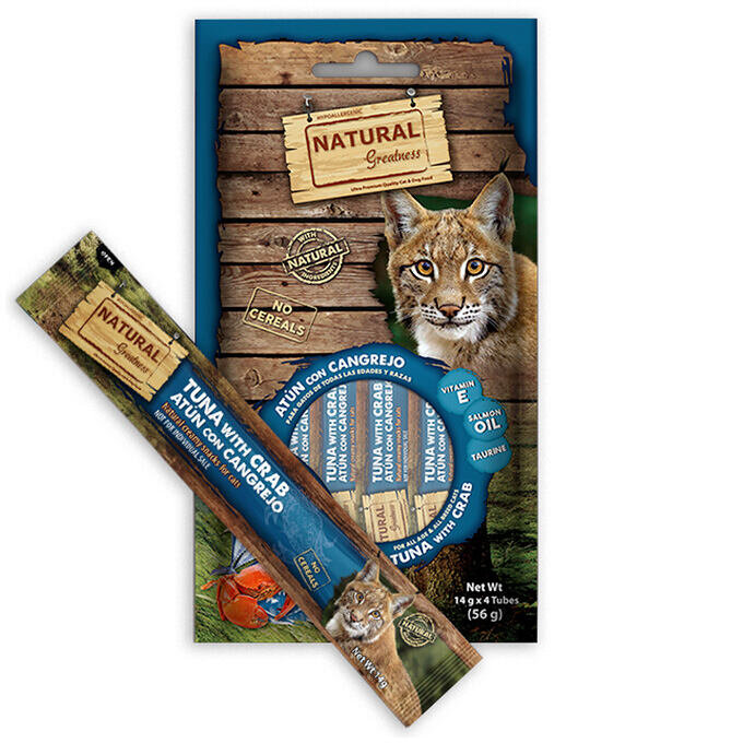doplňkové krmivo pro kočky - pamlsek vhodné od 2 měsíců věku hypoalergenní krémová měkká pochoutka bez obilovin z prvotřídního masa tuňáka a kraba obsahuje taurin, vitamín E a lososový olej, které pomáhají udržovat zdravou kůži a hedvábnou, lesklou srst kočky balení obsahuje 4 sáčky, každý po 14...