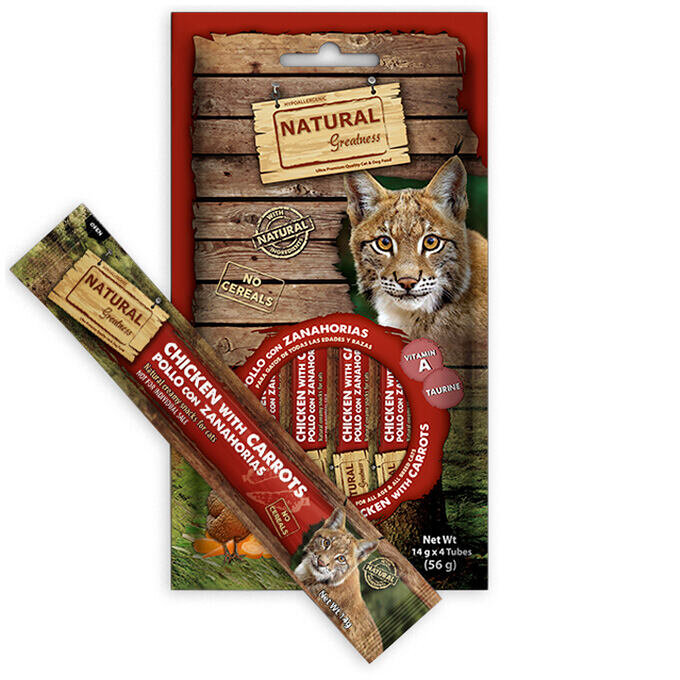 doplňkové krmivo pro kočky - pamlsek vhodné od 2 měsíců věku hypoalergenní krémová měkká pochoutka bez obilovin vyrobená z prvotřídního kuřecího masa a mrkve obohacená o taurin a vitamín A podporuje zdraví očí a pomáhá zlepšovat zrak kočky balení obsahuje 4 sáčky po 14 gramechSložení: Kuře (26...