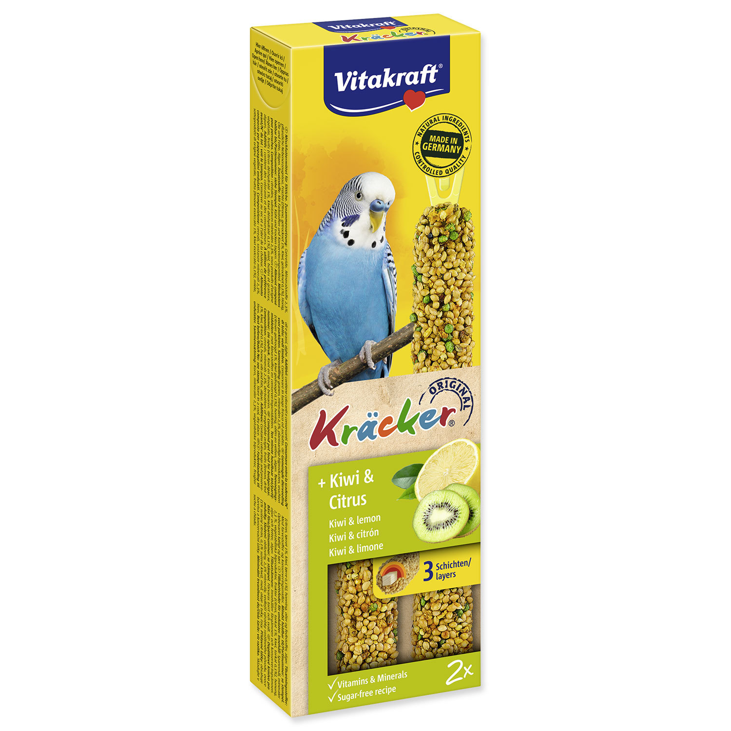 Doplňkové krmivo pro andulky a malé papoušky. Speciální tyčinky s kiwi. Krmný návod: zavěste do klece a nechte volně k dispozici.Složení: obiloviny, cukr, ovocné plody (0,1% kiwi), med mořské řasy.Jakostní znaky: hrubé proteiny 10%, vlhkost 8,7%, hrubé oleje a tuky 2,9%, hrubé popeloviny 5,5%,...