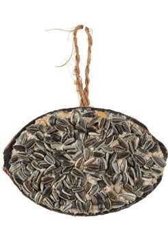 Kokosová skořápka plněná lojem a slunečnicovými semínky