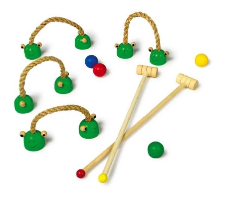 Sada obsahuje 10 kusů 2 pálky, 4 kuličky a 4 oblouky ze dřeva s lanem a s legračními obličeji žabky, to vše v síťovém obalu. Klasická verze kroketu pro vnitřní i venkovní použití.Německá firma Legler zaměřená na výrobu kvalitních dřevěných hraček od roku 1996. Všechny dřevěné hračky značky small...