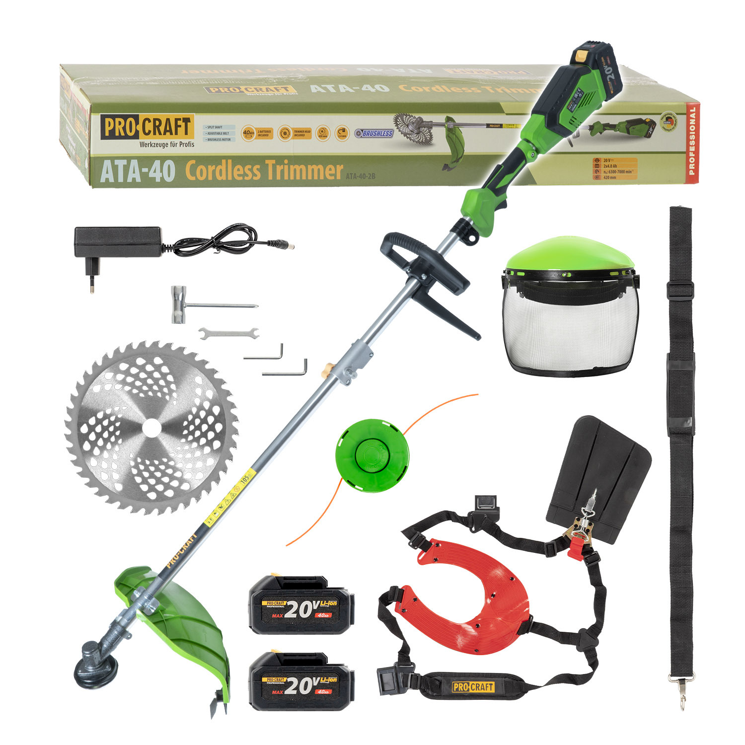 Aku křovinořez Procraft ATA-40 + dvouramenný popruh a ochranný štít | ATA-40/20SH/CH/FACE-GUARD