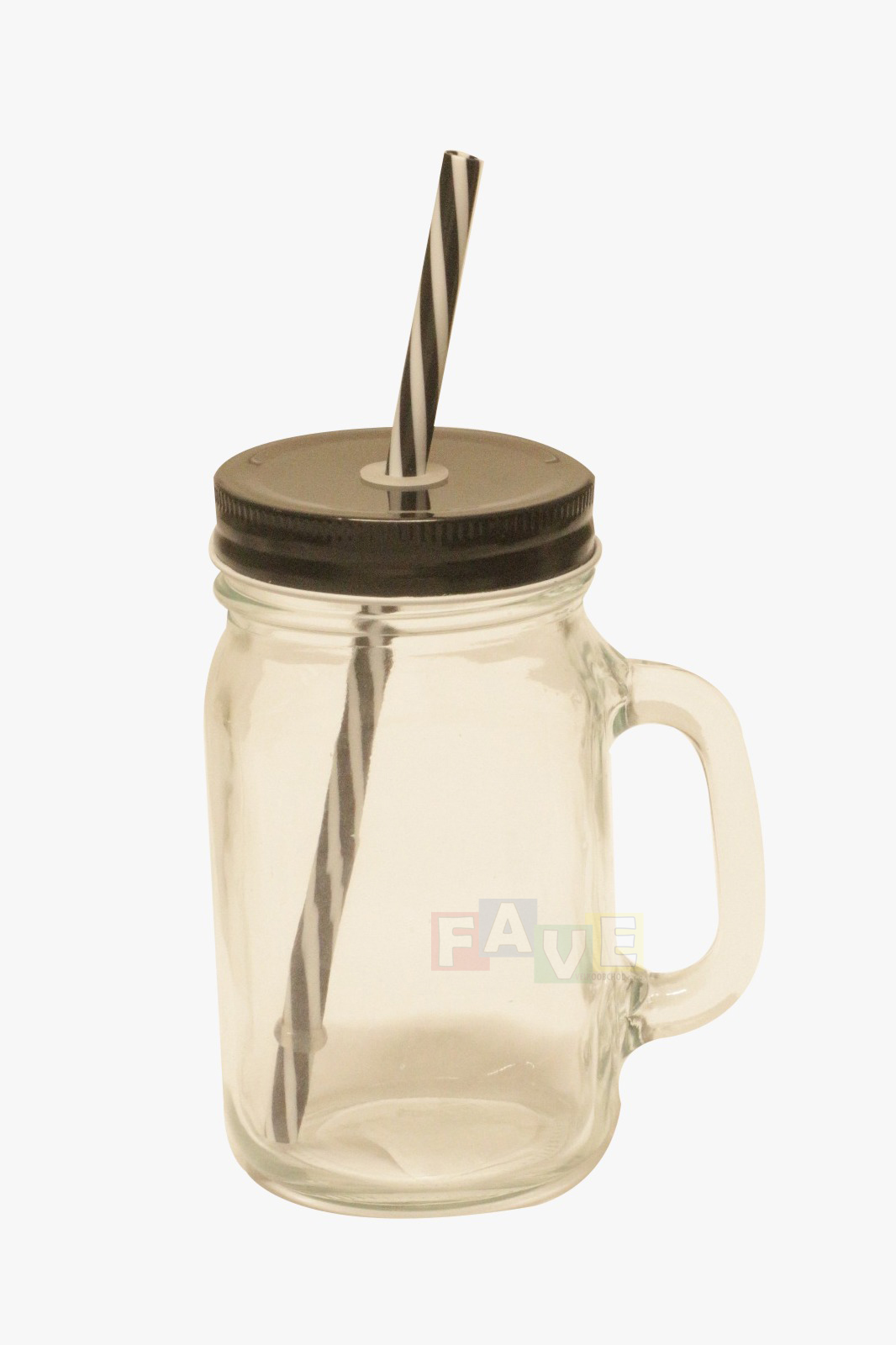Hrnek s víčkem a brčkem; 7,5x7,5x13,5 cm; 420 ml; sklo/kov/plast; černé víčko