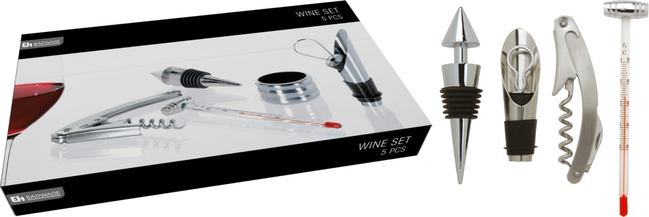 Velmi praktická sada pro včechny milovníky vína. Sada obsahuje vývrtku, zátku, nálevku se zátkou a teploměr.Materiál: nerez, plastRozměry:krabice 23,3x13,3x3,3 cm prečítať celé