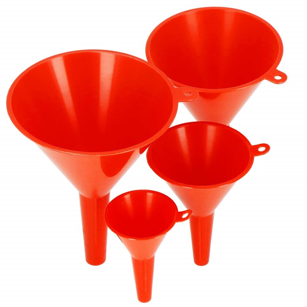 Sada praktických trychtýřů se 4 různými velikostmi. Univerzální použití, dlouhá životnost. Odolný materiál v jasných barvách. Závěsné rukojeti, snadné užívání. Vhodný doplněk do kuchyně, garáže, nebo dílny. prečítať celé