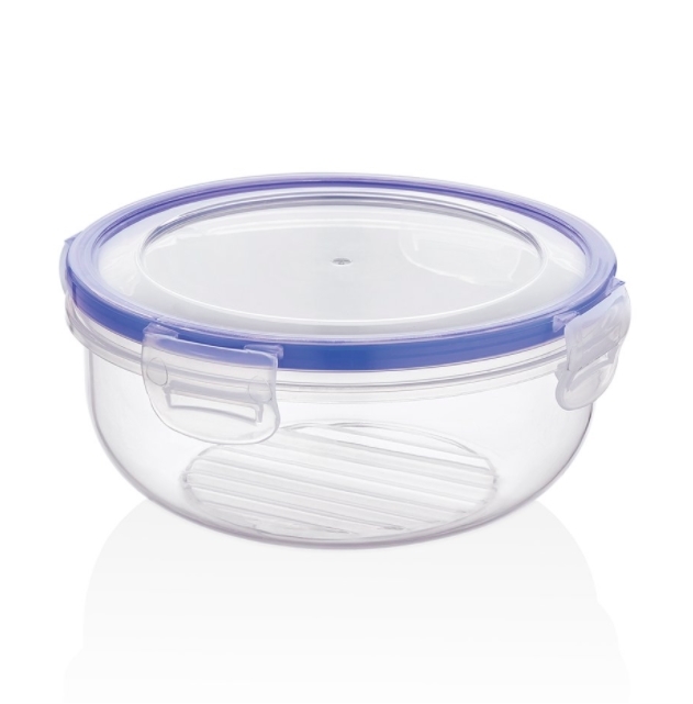 kvalitní plastová dóza s víčkem s klipy na hermetické uzavření vhodná do myčky nádobí, mrazničky a mikrovlnné trouby vlnkované dno umožňuje odtok tekutiny z uložené potraviny průměr 18 a výška 7.5 cm, objem 1350 ml EAN 8697853095165 prečítať celé