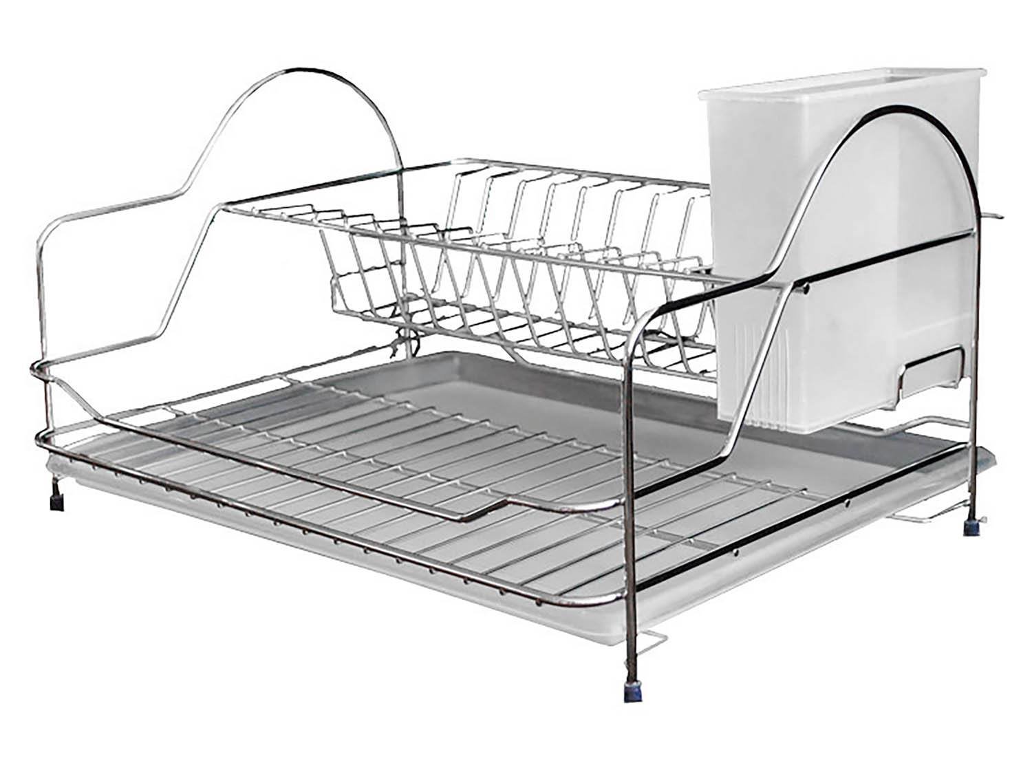 Kvalitní dvoupatrový odkapávač nádobí vyrobený z chromovaného drátu vysoké kvality a plastového odkapávacího podnosu.