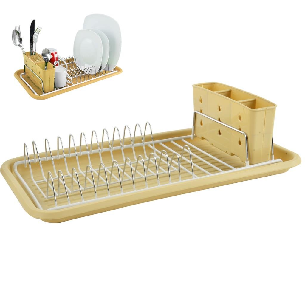 Odkapávač na nádobí s konstrukcí na odkládání talířů a příborů doplněný tácem. Povrchová úprava drátěné části, která je nejvíce ve styku s vodou, brání rezavění. Odkapávač na příbory je vyjímatelný. Materiál: drát s povrchovou úpravou, plast. Snadná údržba. Rozměry: 43x23x12 cm.