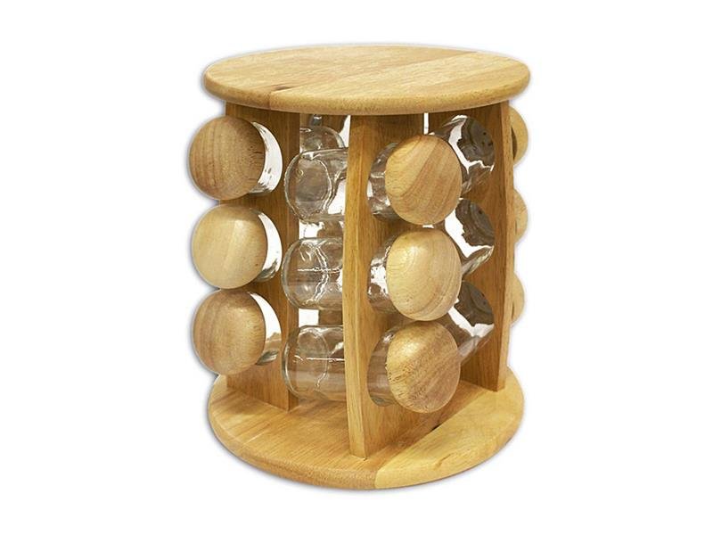 12dílná sada kořenek je uložena v otočném dřevěném stojanu, ze kterého je snadno vyjmete a do něj opět uložíte.Skleněné kořenky jsou opatřeny plastovými sypátky PE a uzávěry z tvrdého dřeva. Rozměr stojanu: v. 24 cm, pr. 20 cm. Objem kořenky 80 ml.Materiál: tvrdé dřevo. prečítať celé