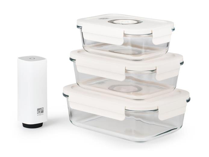 - Obsah balenia: 3 vákuové dózy (630, 1 040, 1 480 ml) + ručná vákuová pumpa