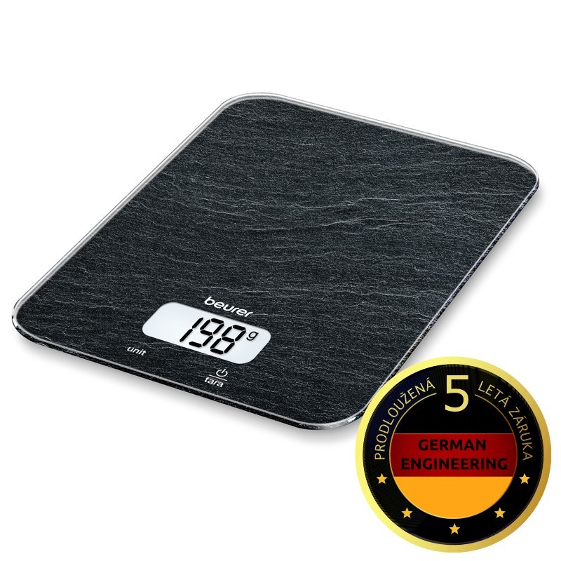 kuchyňská váhasnadno čitelný displej LCDfunkce automatického vypnutímax. zatížení 5 kgrozlišení 1 gfunkce tarapřepočet z g / oz / lb: oz / ml / fl.ozmoderní ovládánísnadno se čistí povrch ze sklaLCD displej: 4,6 x 2,4 cmvelikost číslic: 20 mmultra plochá pouze 1,65 cm vysokáindikace...
