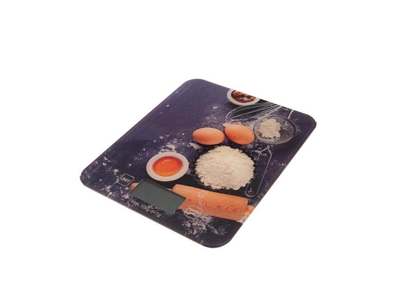 Váha kuchyňská digitální s LCD displejem, s možností vážení v g, oz, ml. Váživost 10 kg, minimální měrná hodnota 1 g, automatické vypnutí, možnost vynulování TARE. Napájení: 2x AAA 1,5V baterie (nejsou součástí). Materiál: sklo, plast. S dekorem. Snadná údržba. Indikátor slabé baterie a přetížení. Rozměry: 18,5x22,5x2 cm.
