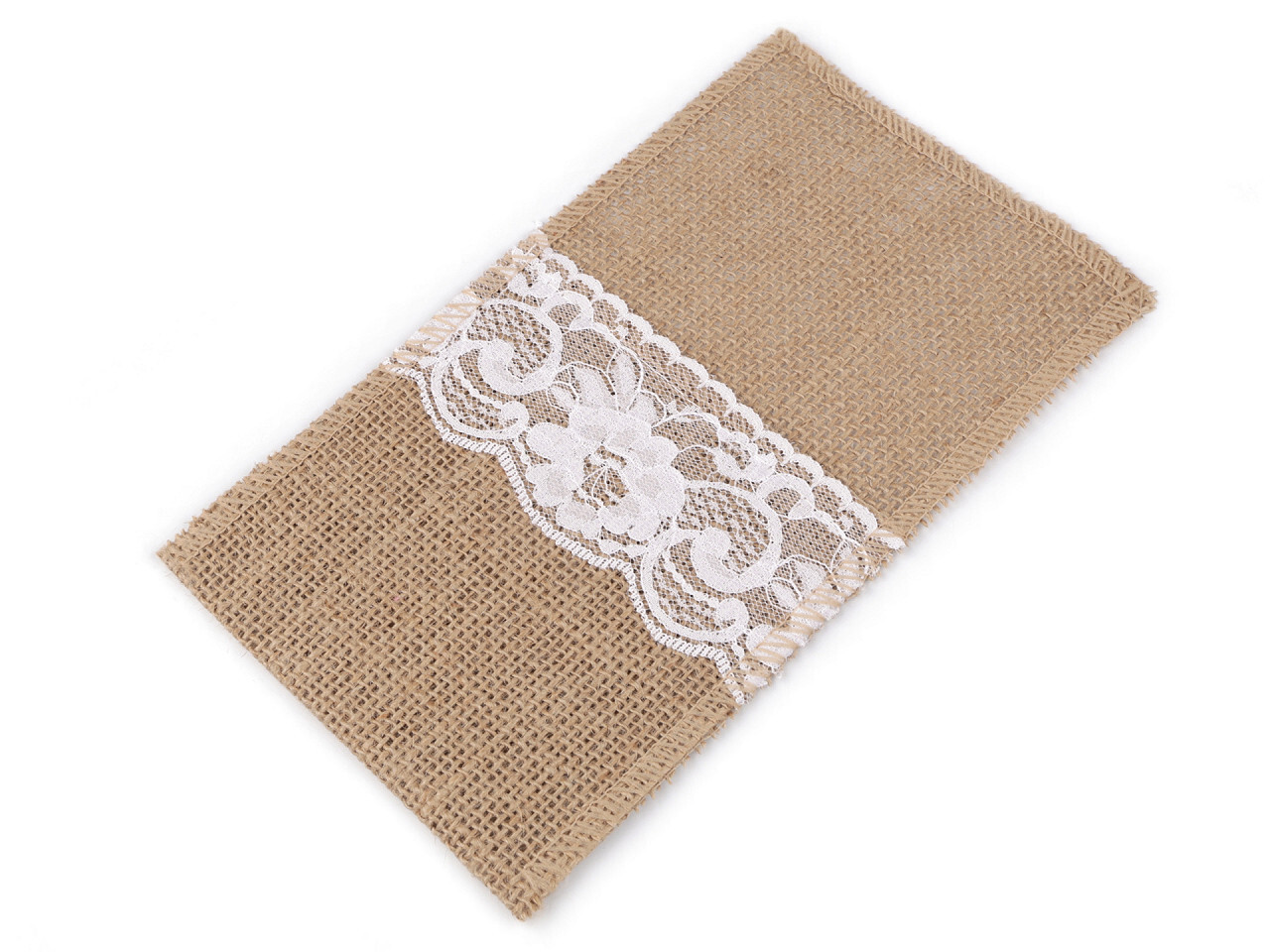 Uchvátila vás juta? Máte rádi dokonale prostřený stůl s vytříbenými detaily? V tom případě nezapomeňte na jutovou kapsu na příbory, která je oživena krajkou. Kapsa je dostatečně prostorná na celý příbor. Varianta č. 1 má krajku vyrobenou z polyamidu. Varianta č. 2 má krajku vyrobenou z bavlny.