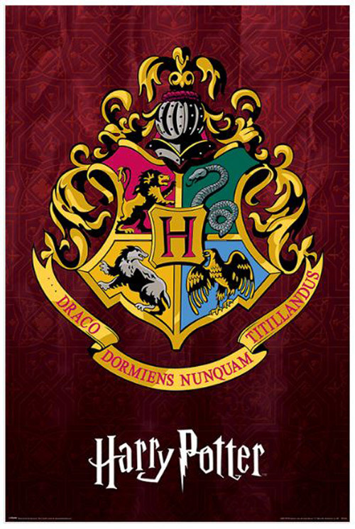 Plakát se znakem Bradavic a grafikou filmové ságy o Harrym Potterovi.