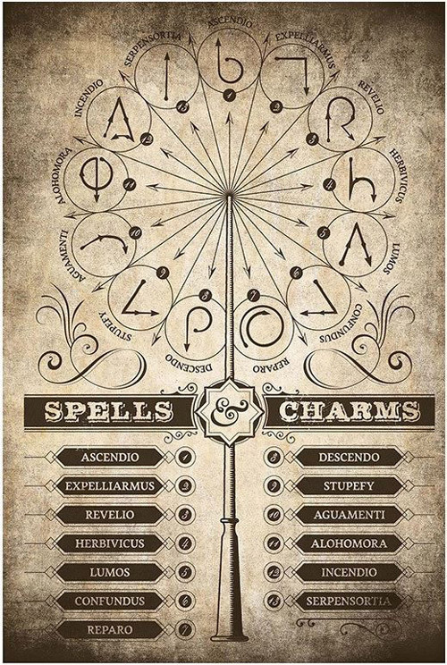 Plakát se grafikou Spells and Charms z filmové ságy o Harrym Potterovi.