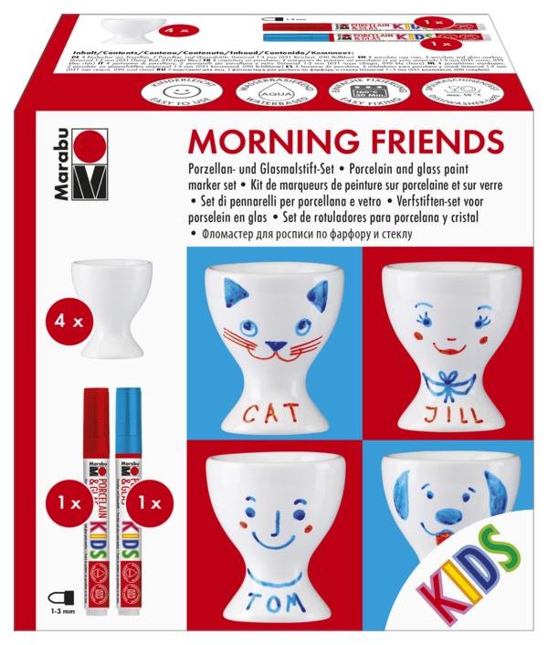 Sada Marabu KiDS Porcelain & Glas Painter „Morning Friends“ umožňuje dětem rychle a snadno vyzdobit úžasné šálky na vajíčka. Ať už přidáte legrační obličeje, jména své rodiny nebo vzory; ať už jej použijete na snídani doma nebo jako malý dárek - vaše vejce naměkko chutná dvakrát tak dobře z vlastního šálku! Obsah: 4 x bílé šálky na vejce (6,7 x 5,7 x 5,7 cm), 2 x popisovač na porcelán a sklo 1-3 mm (světle modrá 090, třešňově červená 031)