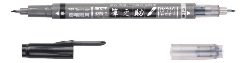 Oboustranný fix Fudenosuke (brush pen) se dvěma elastickými štětcovými hroty (typu soft): černým pro kreslení obrysů a šedým pro stínování.