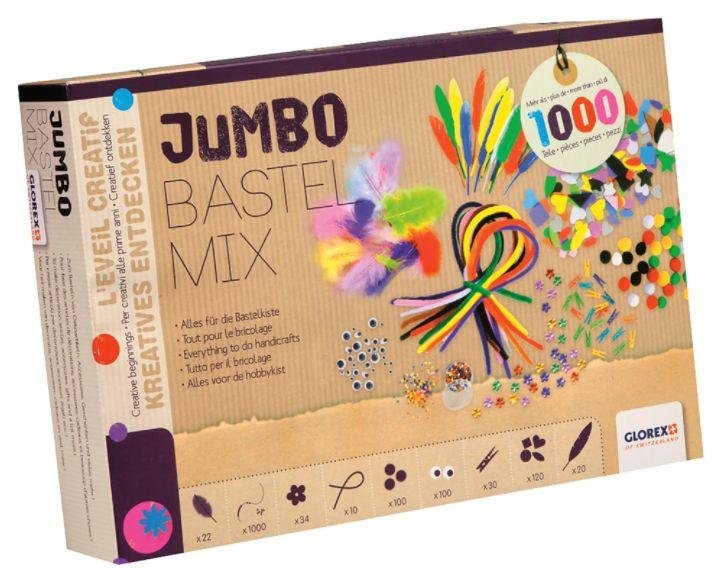 Jumbo Bastelmix je skvělá kreativní sada se všemi základními materiály. Obsahuje peří, indiánské peří, bambulky, pěnová guma, lisované díly, kolíčky na prádlo, ozdobné květiny, oči a rokajlové korálky. Více než 1000 dílů. Nevhodné pro děti do 3 let, protože malé části mohou způsobit nebezpečí udušení. Nebezpečí udušení!