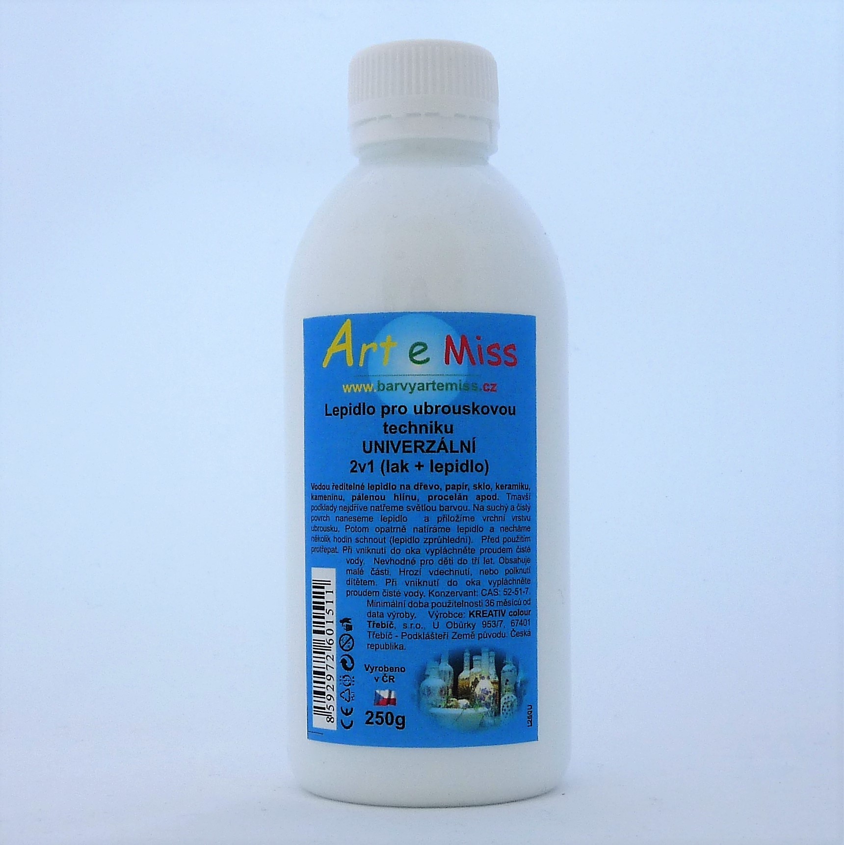 Speciální akrylové lepidlo dobře připevní ubrousek a časem nežloutne.Po zaschnutí je lesklé a voděodolné.Je vodou ředitelné, to znamená, že na čištění pomůcek po použití stačí obyčejná voda, ale pouze do chvíle než zaschne. Zaschlé lepidlo lze z některých povrchů vyčistit lihem.Vydrží v interiéru...