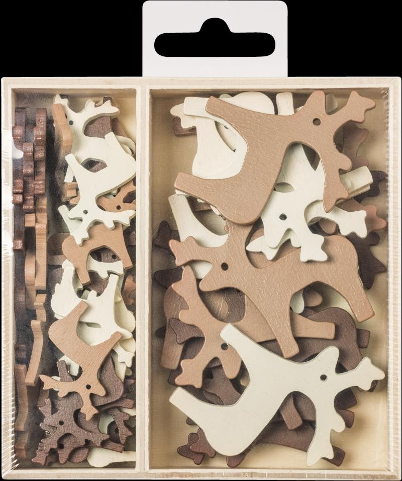 Dřevěné ozdoby vhodné pro dekorační zdobení, výrobu přání, dětskou tvorbu. Baleno v dřevěné krabičce 10,5 x 10,5cm. Barvy: slonová kost, hnědá, světle hnědá. prečítať celé